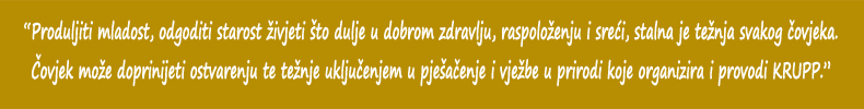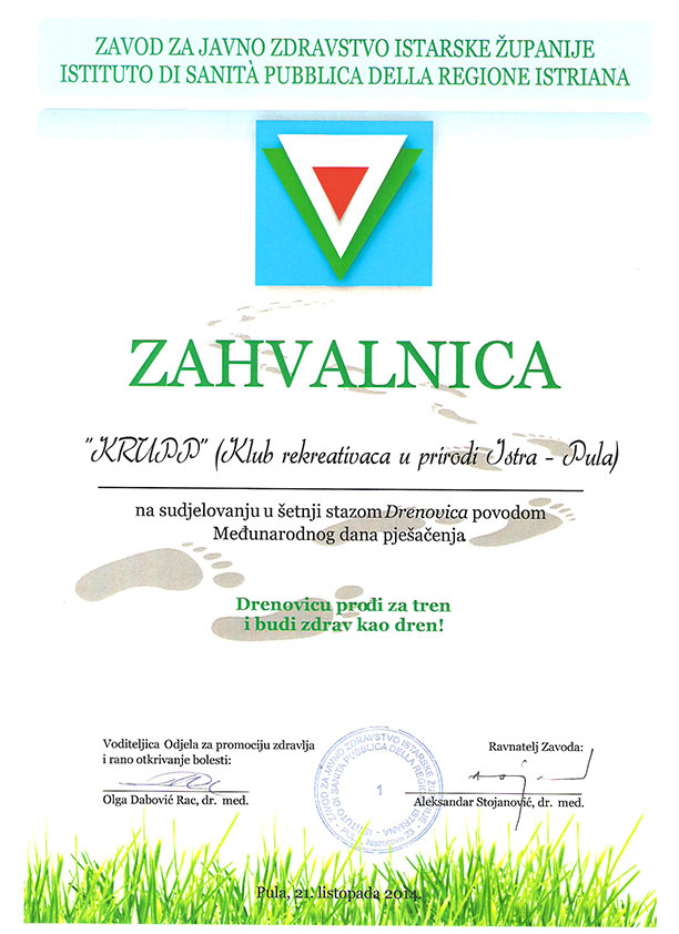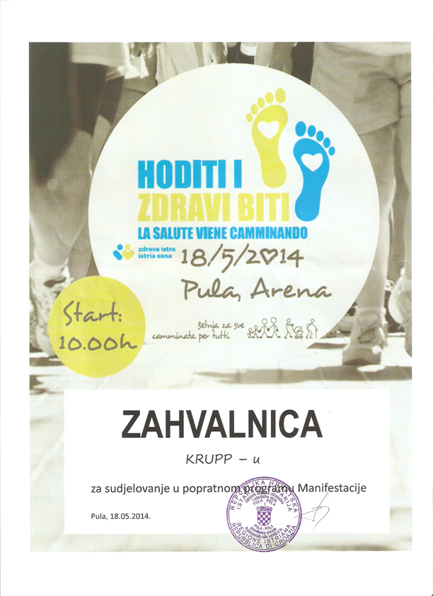 Krupp organizira pješačenje na stazi V. Brijun dužine 8 km, polazak broda je u 9 sati iz Fažane, povratak je u 13 sati. Okupljanje najmanje 30 minuta prije polaska broda. Cijena izleta je 40 kuna po osobi (prijevoz + vodič) uplate se vrše blagajnici Krupp-a može i prije polaska broda u Fažani. Prijevoz do Fažane i marenda nisu osigurani. Za dodatne informacije stojimo na raspolaganju. Nakon povratka s Brijuna u 14 sati je ručak i druženje na Bunarini Verudela za goste i članove
