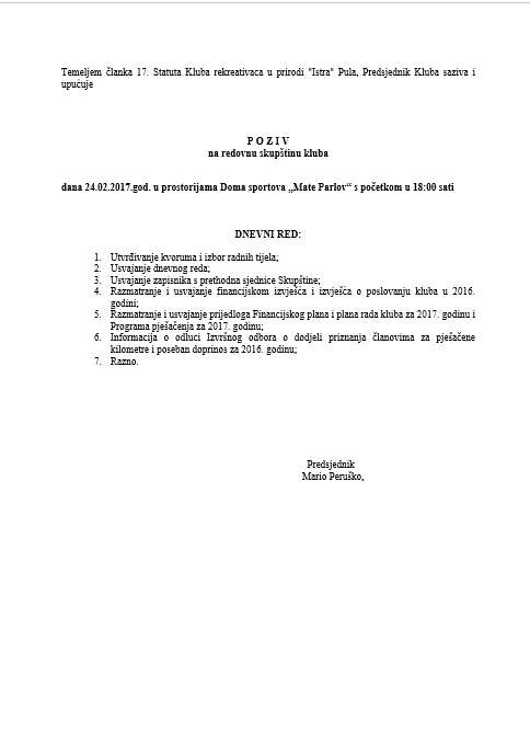 Godišnja Skupština Krupp-a održat će se 24. 02. 2017. god. u prostorijama Dom sportova „Mate Parlov“ Pula, na katu sala II, s početkom u 18 sati. Nakon svečane dodjele priznanja nastavit će se s prigodnim druženjem i zakuskom. Pozivamo sve članove da se odazovu.