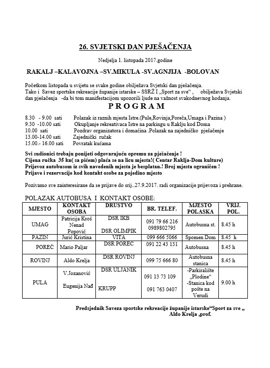 U organizaciji Saveza sportske rekreacije županije istarske „Sport za sve” obilježava se Svjetski dan pješačenja na stazi od Sošići-Žunići do Rovinja -Željeznička stanica, prugom koja je zatvorena 1966. god. Okupljanje rekreativaca Istre je u Sošići (pored škole na rukometnom igralištu) i zajedničko pješačenje do Rovinja gdje je zajednički ručak i druženje uz glazbu, kotizacija je 40,00 kn, plaća se voditelju u busu. Polazak autobusa u 8:30 sati ispred pošte na Verudi i ispted Kauflanda (stajalište gradskog autobusa ) povratak u Pulu između 15 i 16 sati, po dogovoru. Svi zainteresirani građani mogu se javiti na mob. Krupp-a 091 763 0407